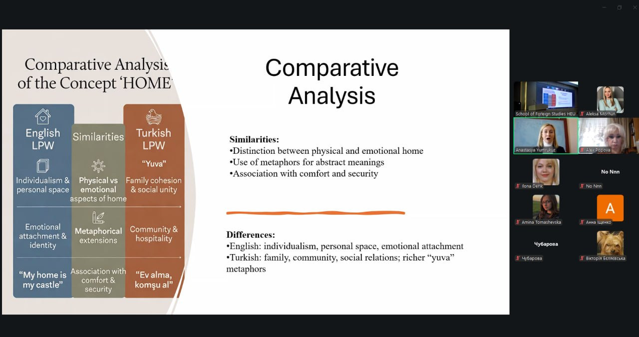 Проректор з наукової роботи, доктор політичних наук, професор Музиченко Ганна В’ячеславівна поділилася досвідом з політичних питань глобального розуміння ініціатив КНР (“The Global Civilization Initiative (GCI) in the System of Global Governance: Essence and Western Attitude”). Декан факультету іноземних мов, доктор педагогічних наук, професор Попова Олександра Володимирівна повідомила про лінгвокультірні аспекти розуміння фундаменту для розвитку глобальної цивілізації (“Linguacultural Foundation in the Spectrum of Global Civilization Development”). Завідувачка кафедри перекладу, теоретичної та прикладної лінгвістики Університету Ушинського» Дерік Ілона Морисівна порушила проблеми і визначила перспективи спеціалізованого перекладу (“Specialized Translation: Challenges and Perspectives”). Завідувачка кафедри германських і східних мов та методики їх навчання Юмрукуз Анастасія Анатоліївна представила результати дослідження концептосфери «ДІМ» в англійській та турецькій мовах (“Linguistic Means of Implementing the Concept HOME in the English and Turkish Language Pictures of the World”).