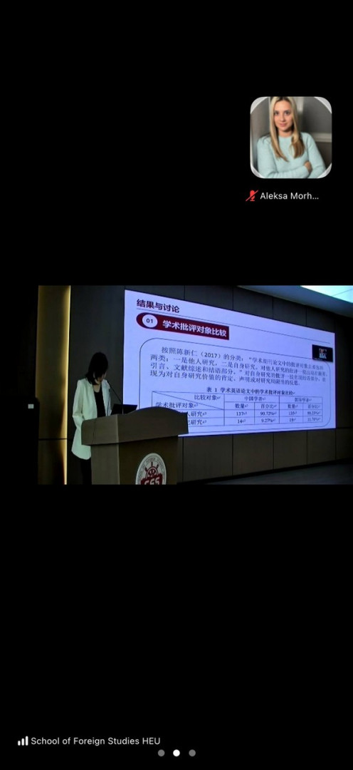 На пленарному засіданні професори китайських університетів-партнерів виступили з доповідями стосовно наукових досягнень у галузі філології та методики викладання іноземних мов, зокрема професор, керівник Центру досліджень зарубіжної літератури Школи іноземних досліджень Харбінського інженерного університету пані Ван Сяошу (“Beyond Boundaries: Mapping the Frontiers of Foreign Literature Studies in the New Era”); доцент, викладач Центру досліджень зарубіжної літератури Школи іноземних досліджень Харбінського інженерного університету пані Чжан Пенжун (“Mirror and Construction: A Cross-Cultural Dialogue on the Images of Elderly Women”); доцент, викладач Школи іноземних досліджень Харбінського інженерного університету пані Чжоу Вейвей (“A Comparative Study of Academic Criticism Act in Academic Papers by Chinese and Foreign Scholars”); доцент, Секретар партійного відділення Першого коледжу з питань викладання та досліджень англійської мови Школи іноземних досліджень Харбінського інженерного університету пані Ван Хуань (“Empowering Pharmaceutical Interpretation Translation with Virtual Simulation technology”); доцент, член Центру лінгвістики Харбінського інженерного університету, Генеральний секретар Міждисциплінарного дослідницького відділу з вивчення другої мови Асоціації іноземних мов провінції Хейлунцзян пані Дун Сяомін (“A diachronic and cognitive expatiation of English verb-particle compound nouns”); професор коледжу міжнародної кооперативної освіти Харбінського інженерного університету пані Шань Вей (“Age-Friendly Language Services of Government Portal Websites in the Three North-eastern Provinces of China”).