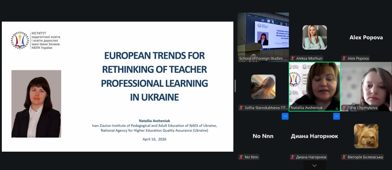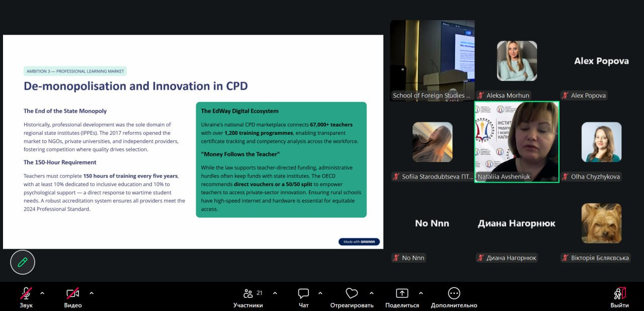 Наталія Миколаївна Авшенюк, доктор педагогічних наук, завідувач відділу зарубіжних систем педагогічної освіти та освіти дорослих Інституту педагогічної освіти і освіти дорослих імені Івана Зязюна НАПН України презентувала компаративний аналіз європейських тенденцій переосмислення професійної підготовки вчителів в Україні (“European trends for rethinking of teacher professional learning in Ukraine”).