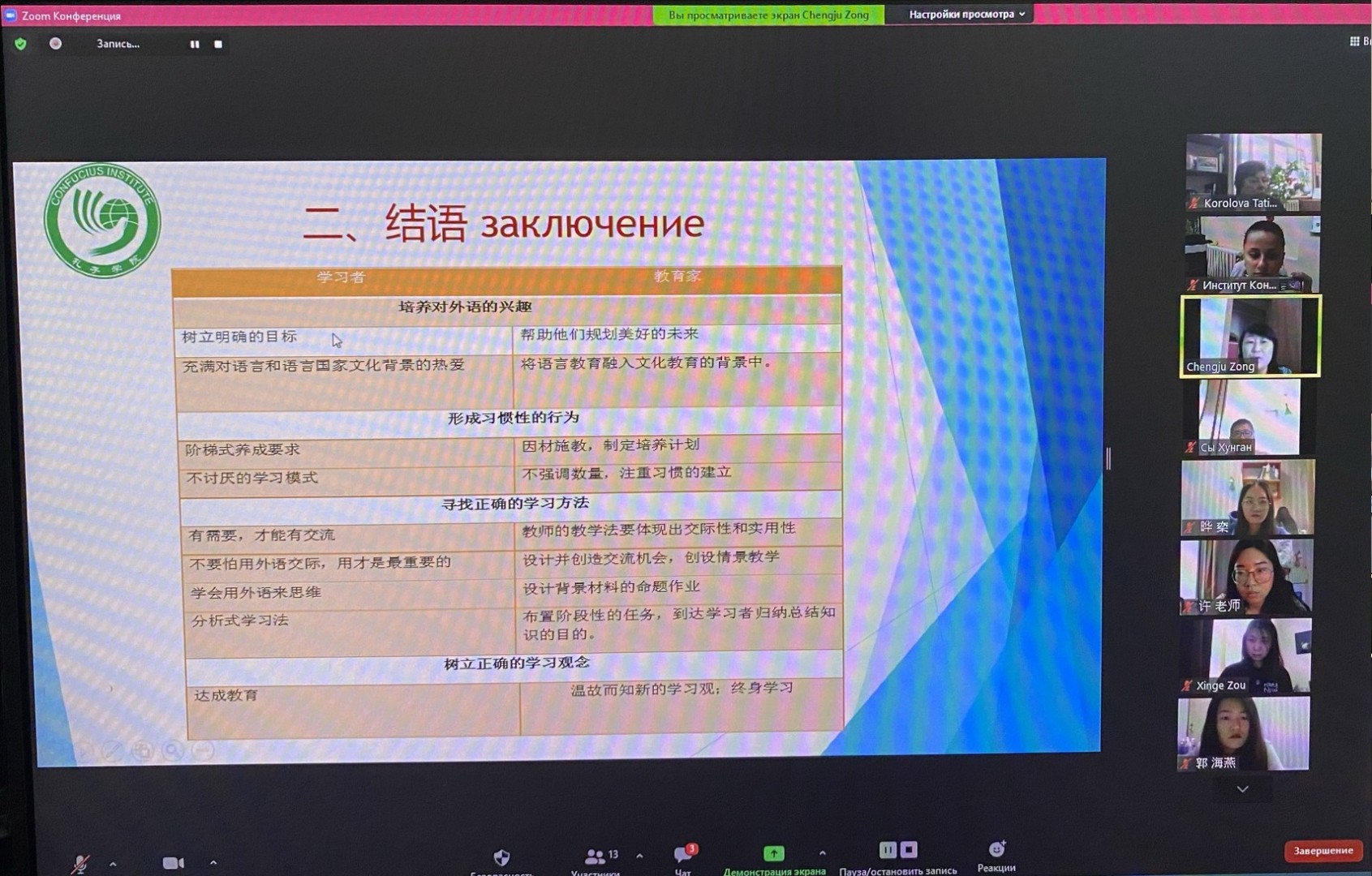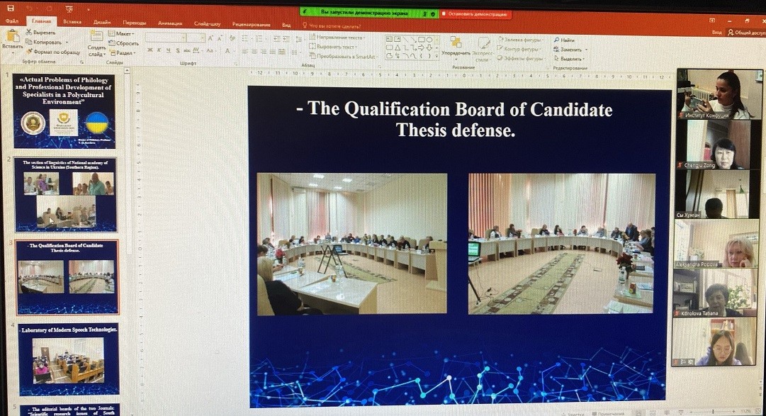 12-13 квітня 2021 року кафедрою перекладу і теоретичної та прикладної лінгвістики Державного закладу «Південноукраїнський національний педагогічний університет імені К. Д. Ушинського», Харбінським інженерним університетом, секцією теоретичної та прикладної лінгвістики Південного наукового центру НАН України і МОН України було проведено VІІ Міжнародну наукову онлайн конференцію «Актуальні проблеми філології і професійної підготовки фахівців у полікультурному просторі». Форум відбувся за підтримки та участі Освітньо-культурного центру «Інститут Конфуція» Університету Ушинського й аспірантів, які навчаються за спеціальністю 015 Професійна освіта (за спеціалізаціями).