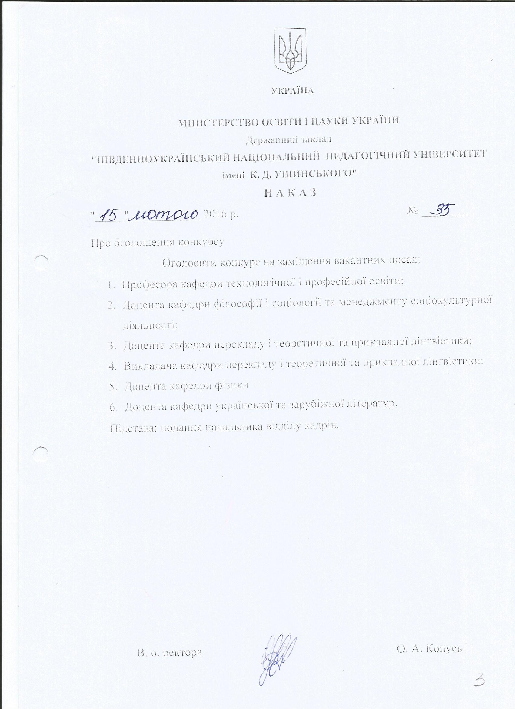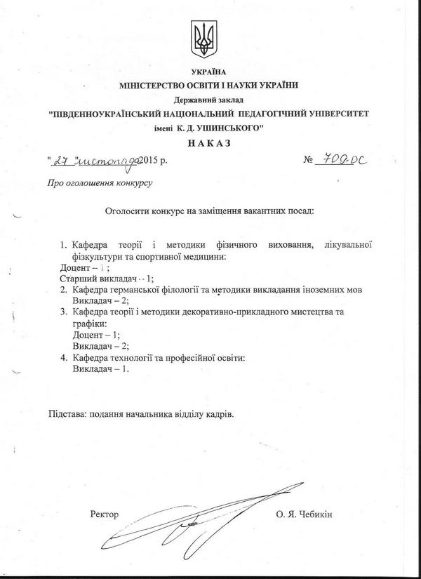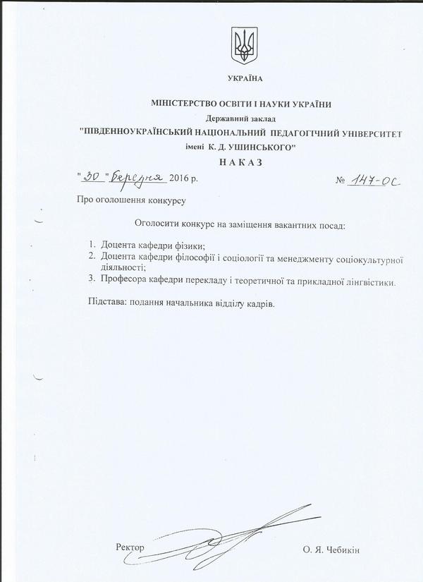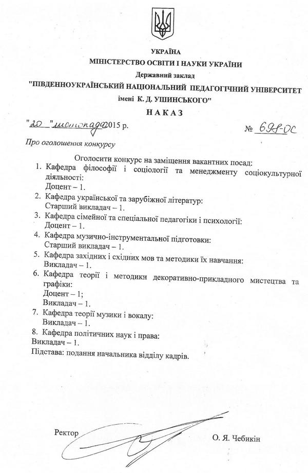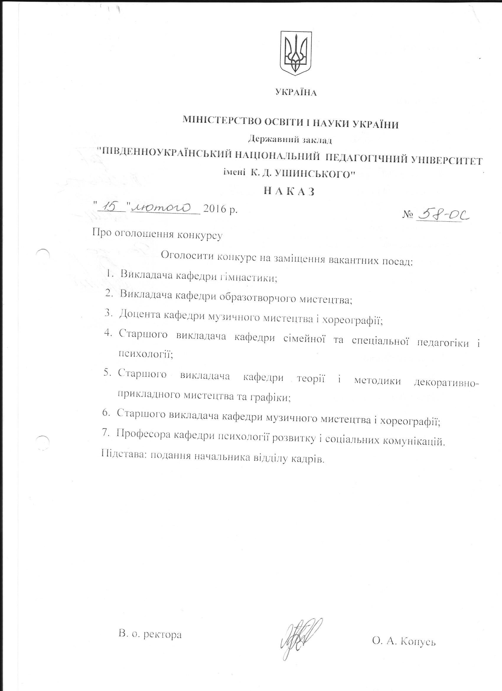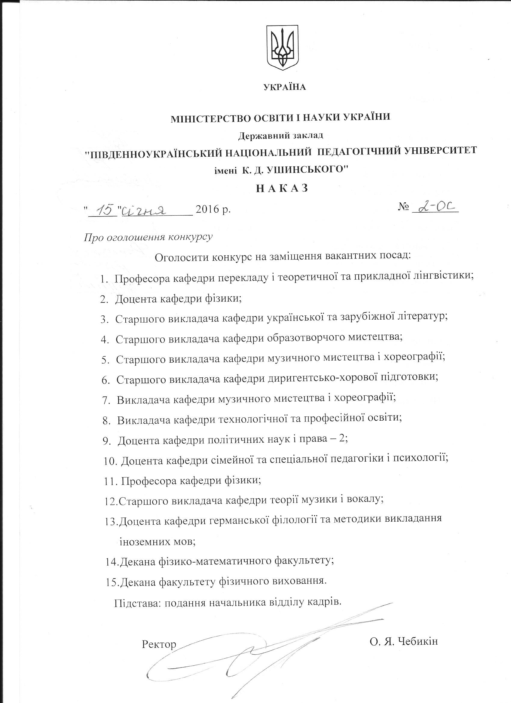 Про оголошення конкурсу на заміщення вакантних посад (наказ від 15.01.2016 р.№2-ОС). Дата оголошення 19.01.16