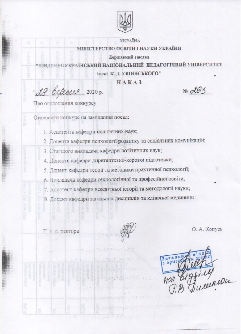 Конкурс на заміщення вакантних посад. Наказ №263 від 29 вересня 2020 року