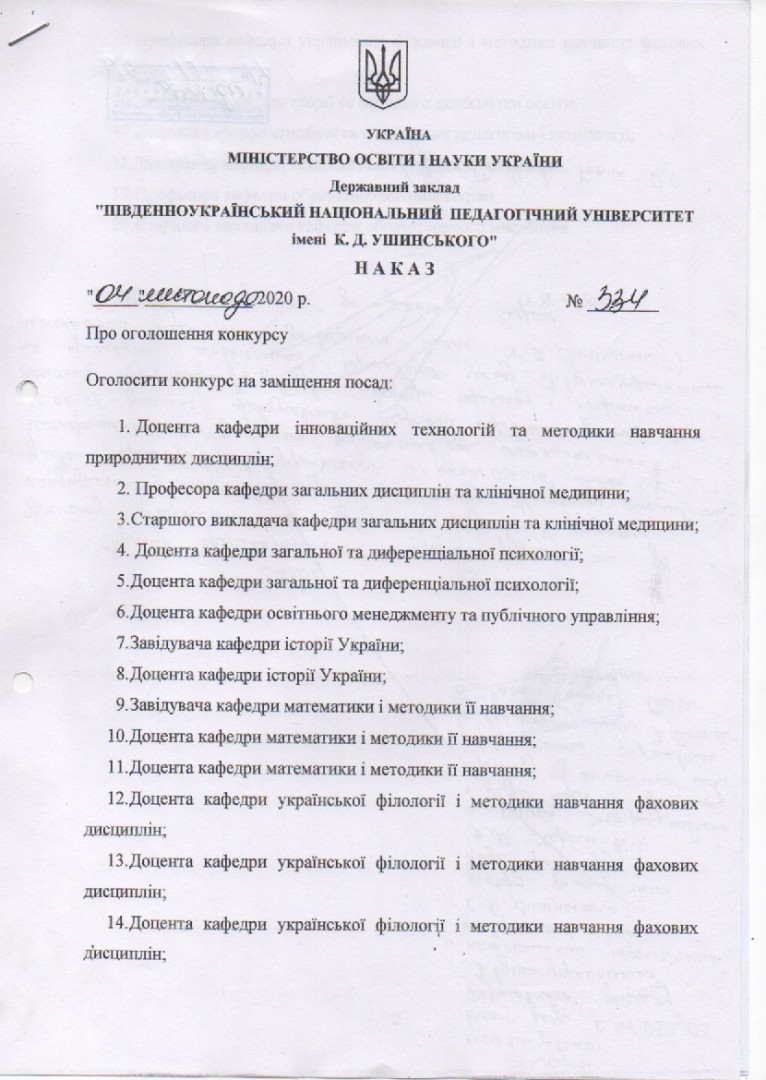 Конкурс на заміщення вакантних посад. Наказ №334від 04 листопада 2020 року