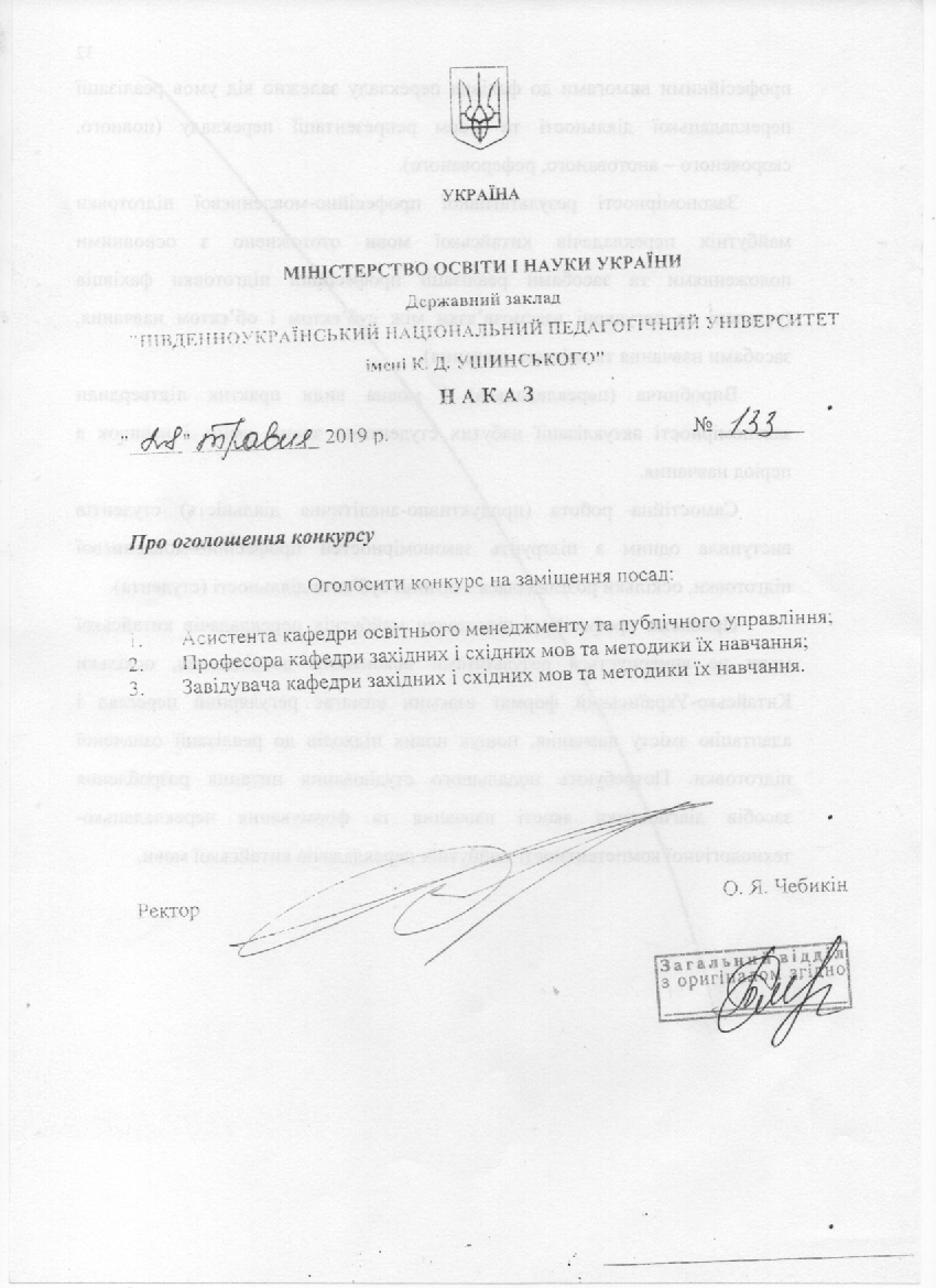 Конкурс на заміщення вакантних посад. Наказ №133 від 28 травня 2019 року