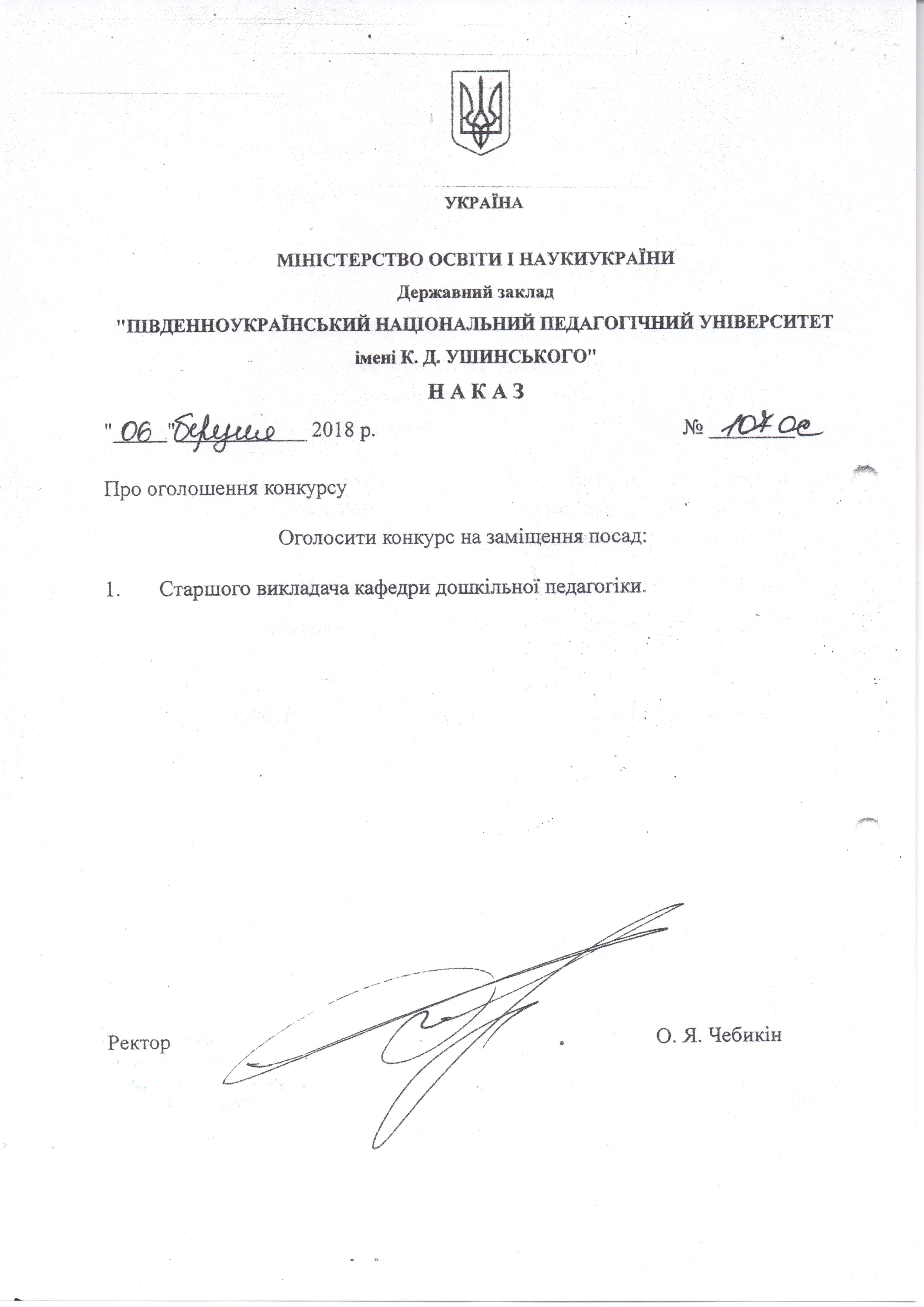 Конкурс на заміщення вакантних посад. Наказ №107-ОС від 06 березня 2018 року.