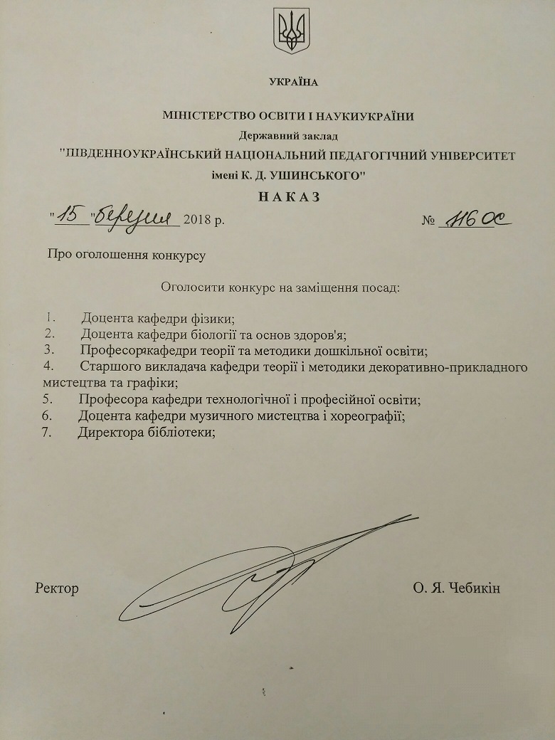 Конкурс на заміщення вакантних посад. Наказ №116-ОС від 15 березня 2018 року.