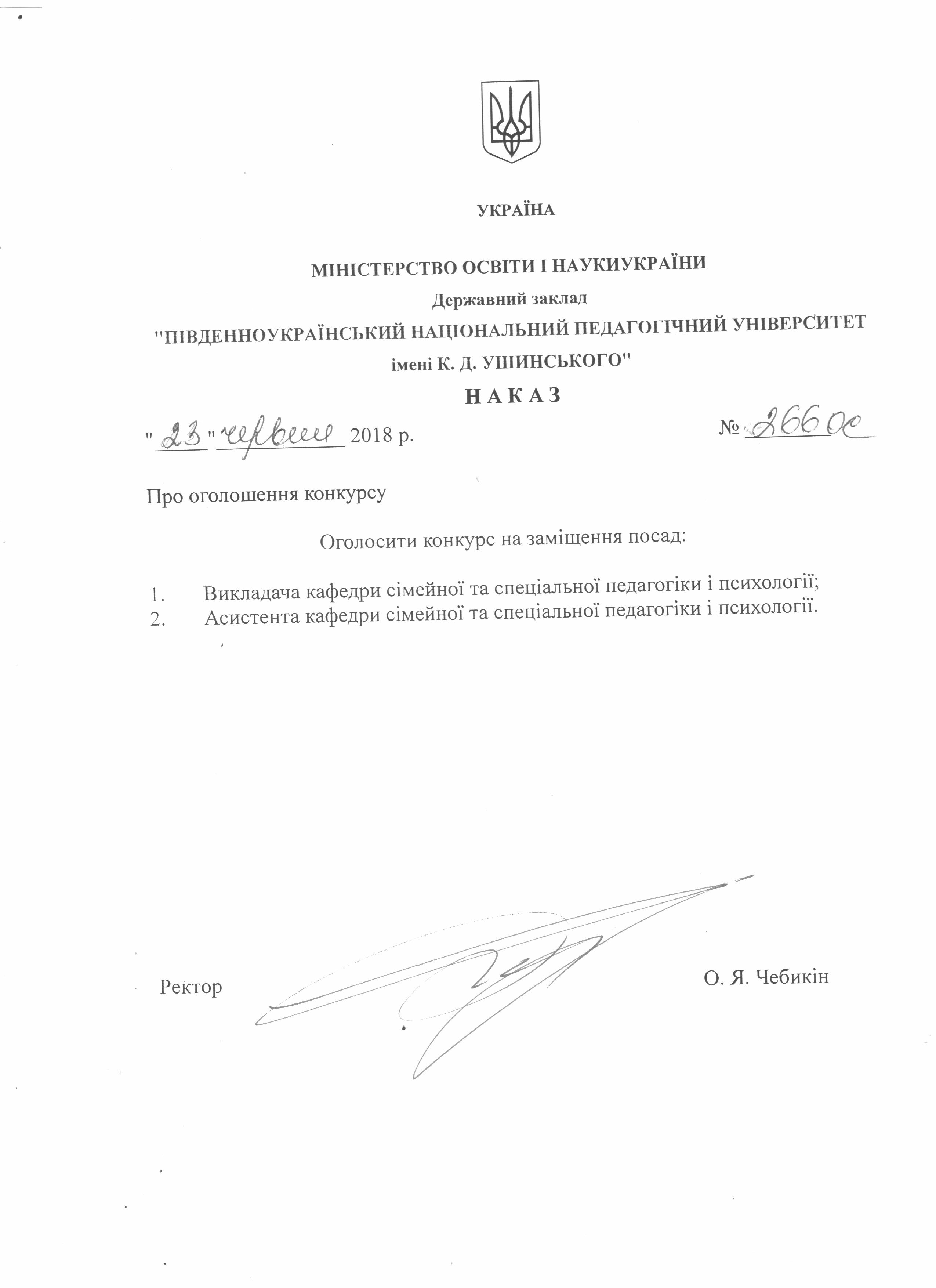 Конкурс на заміщення вакантних посад. Наказ №266-ОС від 23 червня 2018 року.