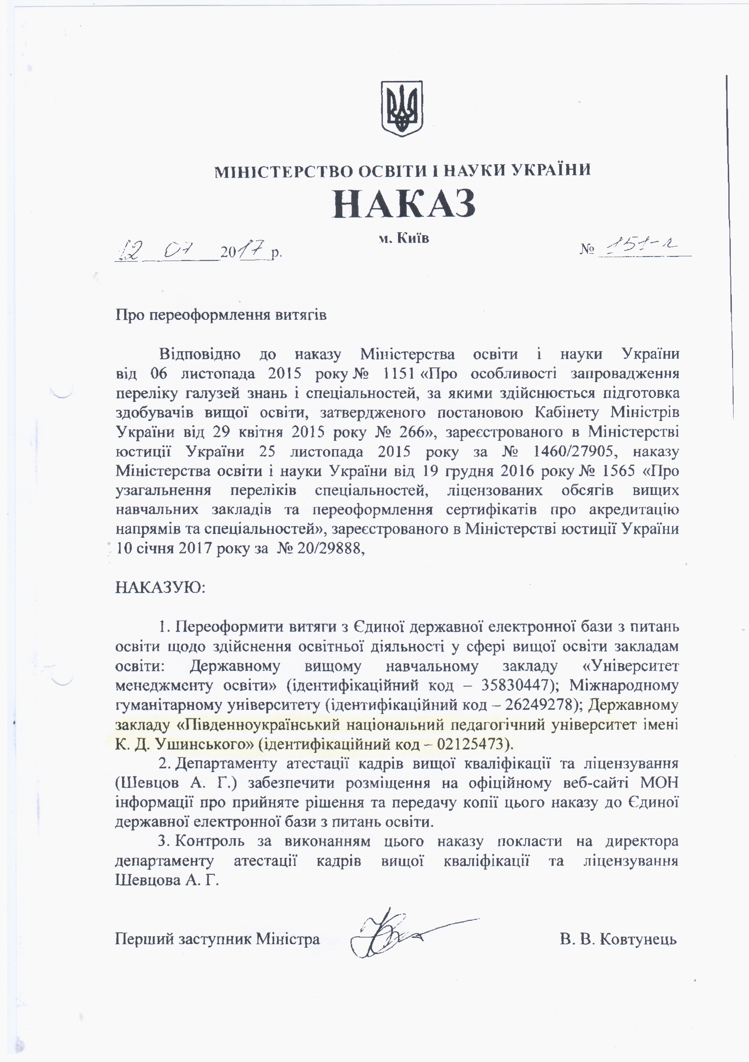 Акт узгодження переліку спеціальностей, за якими здійснюється підготовка здобувачів вищої освіти за ступинями (освітньо-кваліфікаційними рівнями) бакалавра, спеціаліста, магістра та ліцензованого обсягу Державного закладу «Південноукраїнський національний педагогічний університет імені К.Д. Ушинського» Ліцензія: Серія АЕ № 636480 дата видачі 17.06.2015