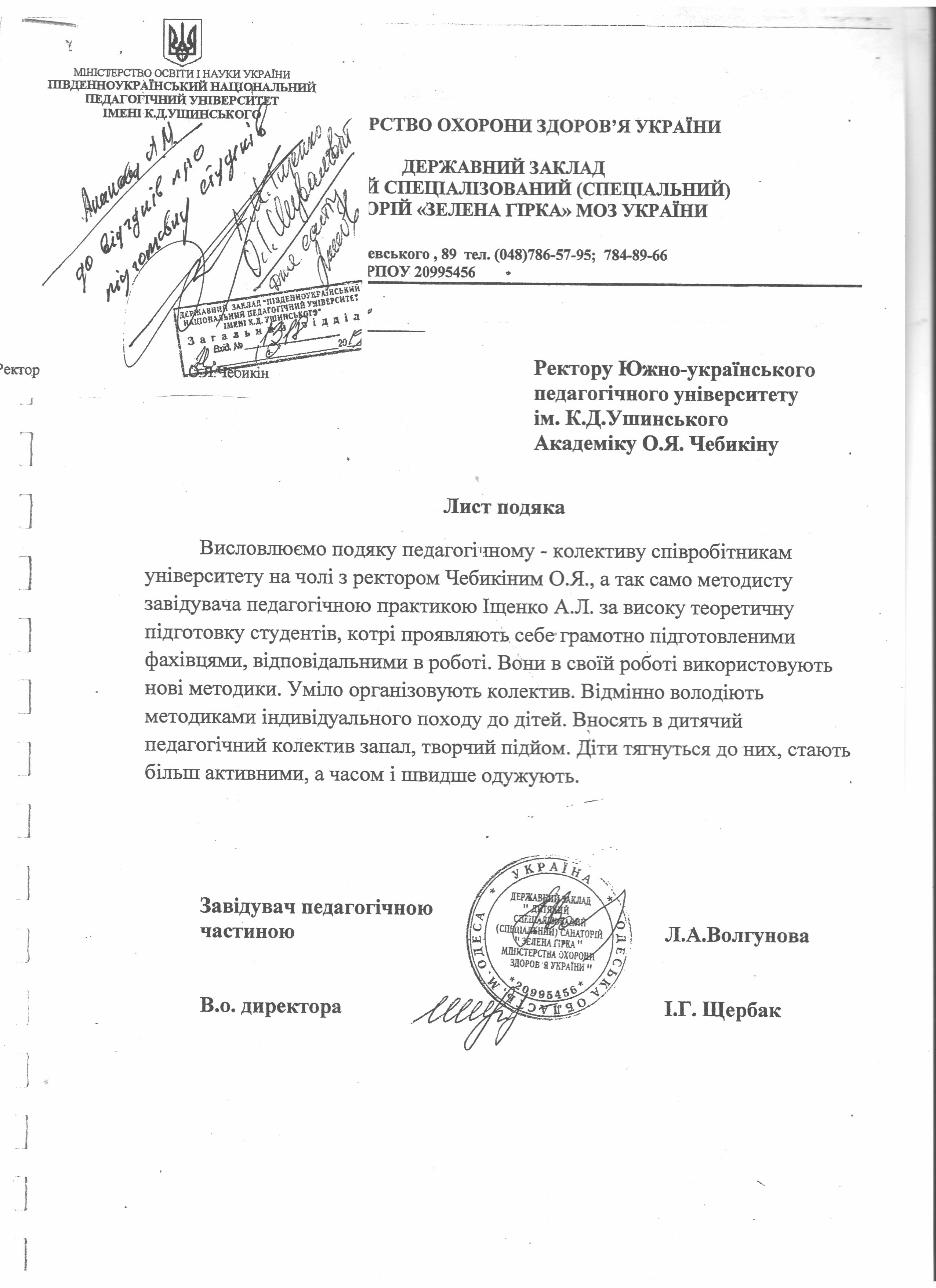 Подяка університету від керівництва дитячого спеціалізованого санаторію "Зелена гірка"