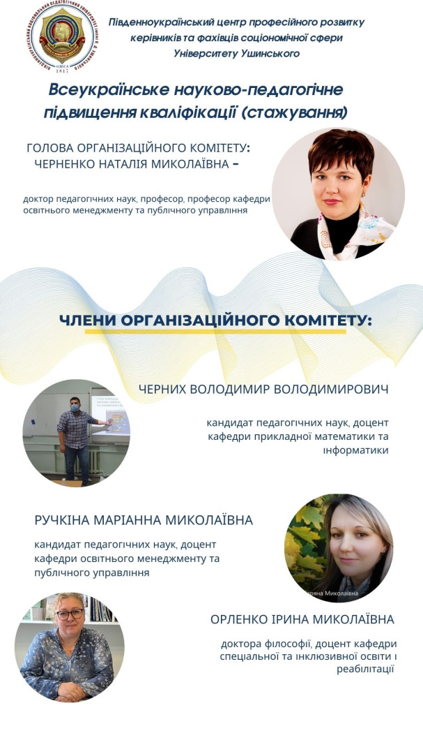 Всеукраїнське науково-педагогічне підвищення кваліфікації (стажування) на базі Південноукраїнського центру професійного розвитку керівників та фахівців соціономічної сфери Університету Ушинського! Увага! Оголошується реєстрація на стажування за програмою: Психолого-педагогічні аспекти реалізації сучасних методів навчання у закладах освіти 04 листопада – 16 грудня 2024 року Обсяг 180 год, 6 кредитів ЕКТС.