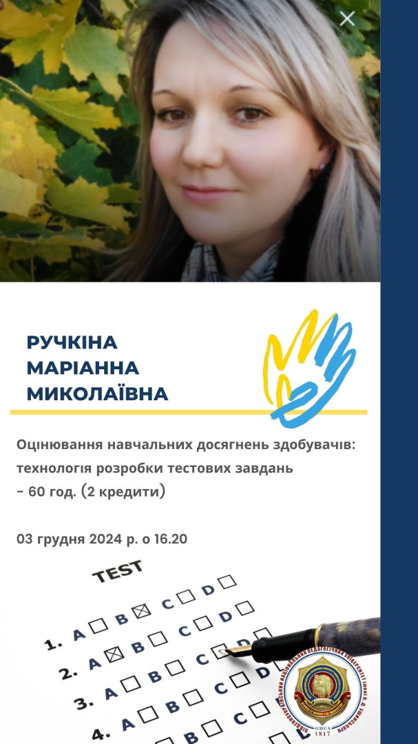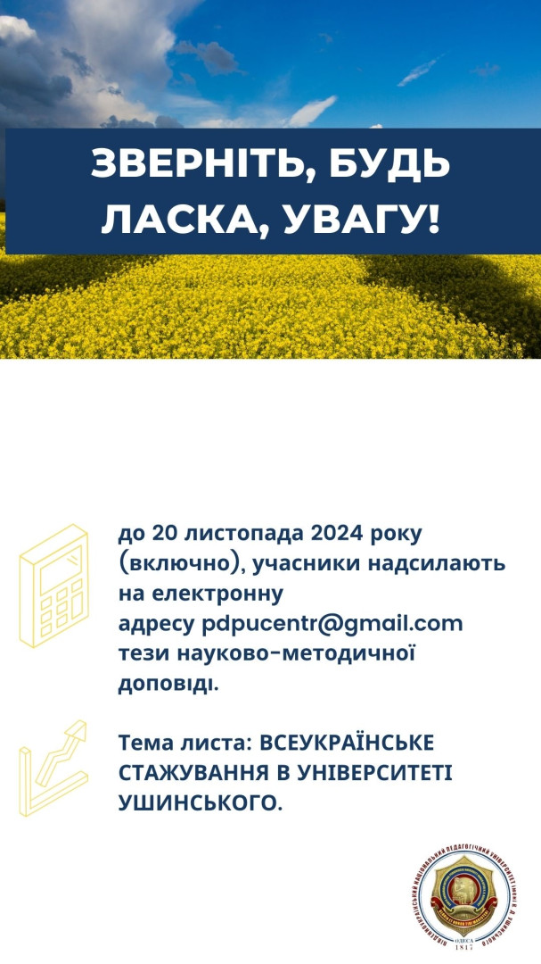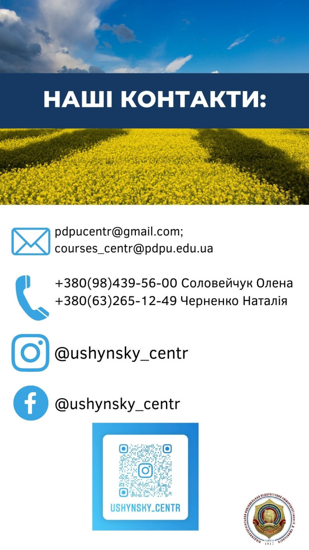 Всеукраїнське науково-педагогічне підвищення кваліфікації (стажування) на базі Південноукраїнського центру професійного розвитку керівників та фахівців соціономічної сфери Університету Ушинського! Увага! Оголошується реєстрація на стажування за програмою: Психолого-педагогічні аспекти реалізації сучасних методів навчання у закладах освіти 04 листопада – 16 грудня 2024 року Обсяг 180 год, 6 кредитів ЕКТС.Кожен учасник підвищення кваліфікації (стажування) отримає сертифікат та збірник тез науково-методичних доповідей в електронній формі. Анкета доступна за посиланням: https://forms.gle/XG4sFAbvhbi1ZWLYA Детальна інформація за телефоном: +380(98)-439-56-00 Соловейчук Олена Поспішайте, кількість місць обмежена! Будемо раді бачити вас на Всеукраїнському науково-педагогічному підвищенні кваліфікації (стажуванні) на базі Південноукраїнського центру професійного розвитку керівників та фахівців соціономічної сфери Університету Ушинського