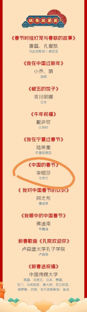 2021年3月10日“汉语桥-我眼中的中国春节”短视频征集活动圆满落幕,我院学生李娅莎(Закопайло Дарья)荣获优秀风采奖。