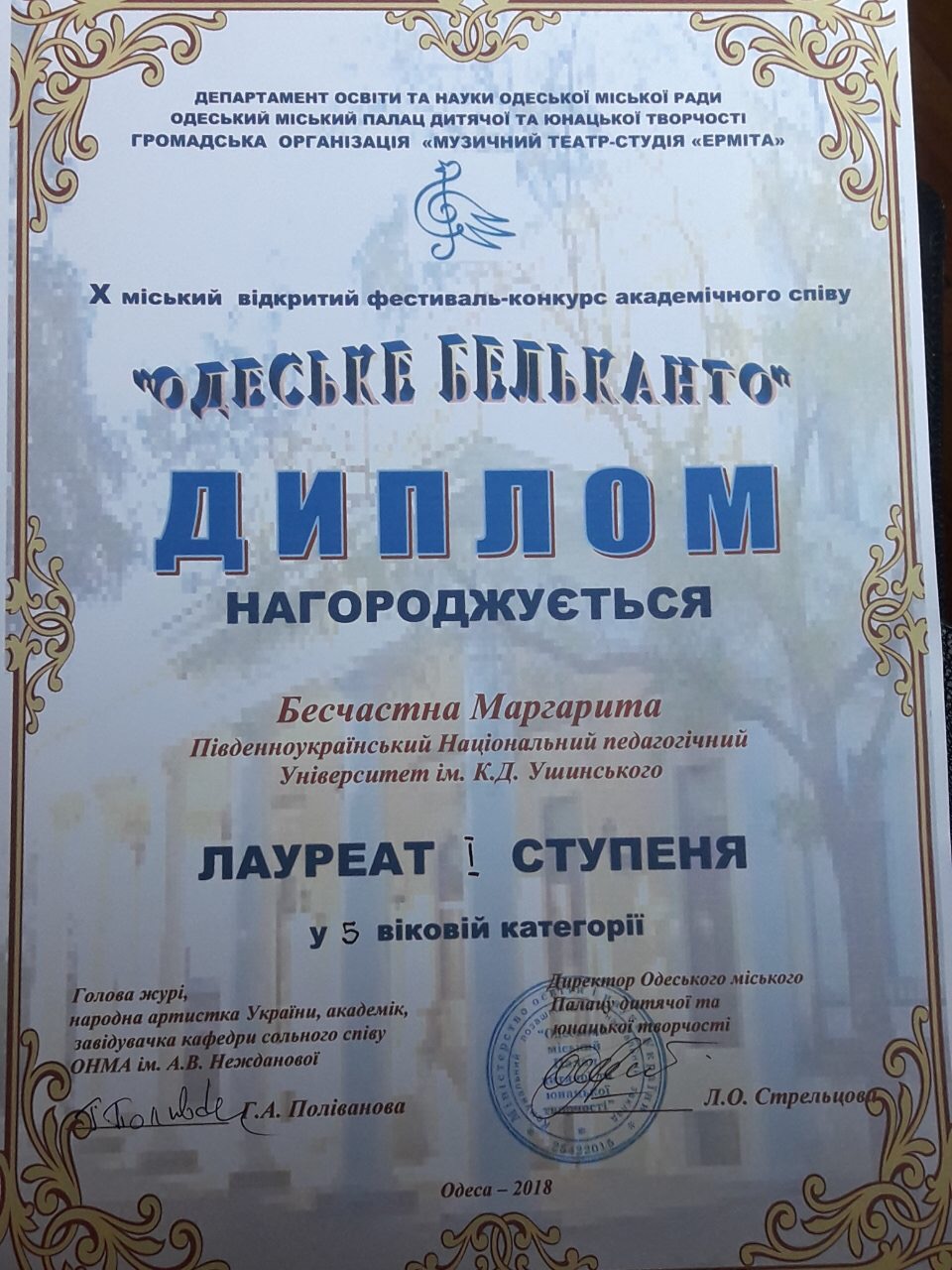 November 24-25 in the premises of the school named after Professor Stolyarsky the city festival-contest of academic singing "Odesa’s bel canto" took place. The jury of the festival-contest included well-known leading masters of vocal academic art. The People's Artist of Ukraine professor G. A. Polivanova headed the jury, she is also the head of the department of solo singing at the Odesa National A.V. Nezhdanova Musical Academy.
