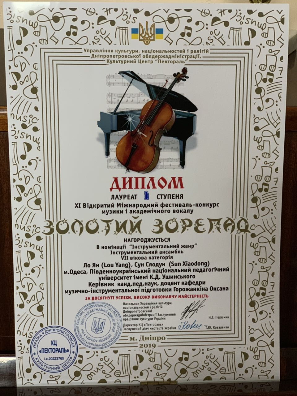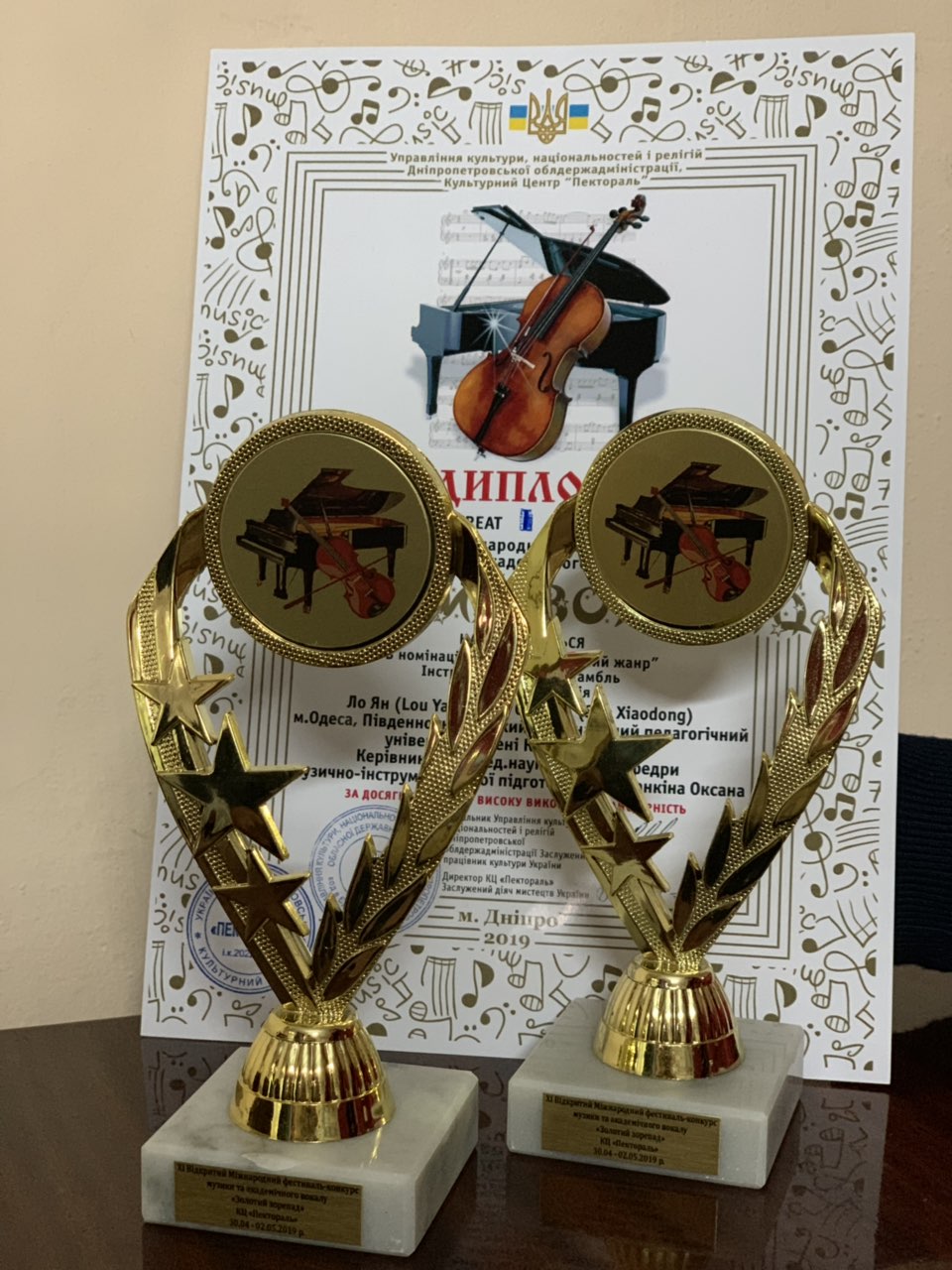Congratulations to the students of the Faculty of Music and Choreography on the victory of the instrumental ensemble composed of Luo Yang and Song Xiaodong (ensemble performance class of Associate Professor Gorozhankina O.Yu.) who won the First Prize of the International Festival of Music and Academic Vocal "Golden Starfall" in Dnipro city on May 11-13, 2019.