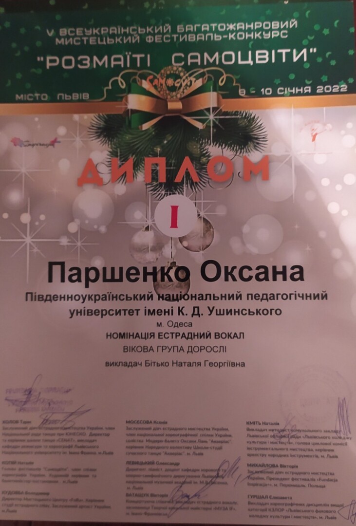 Oksana Parshenko became the winner of the first degree in the nomination "Variety Vocal" (class of teacher Bitko N.G.), Kebuladze Natella became the winner of the second degree in the nomination "Academic Vocal" (class of senior teacher Shafarchuk T.G.).