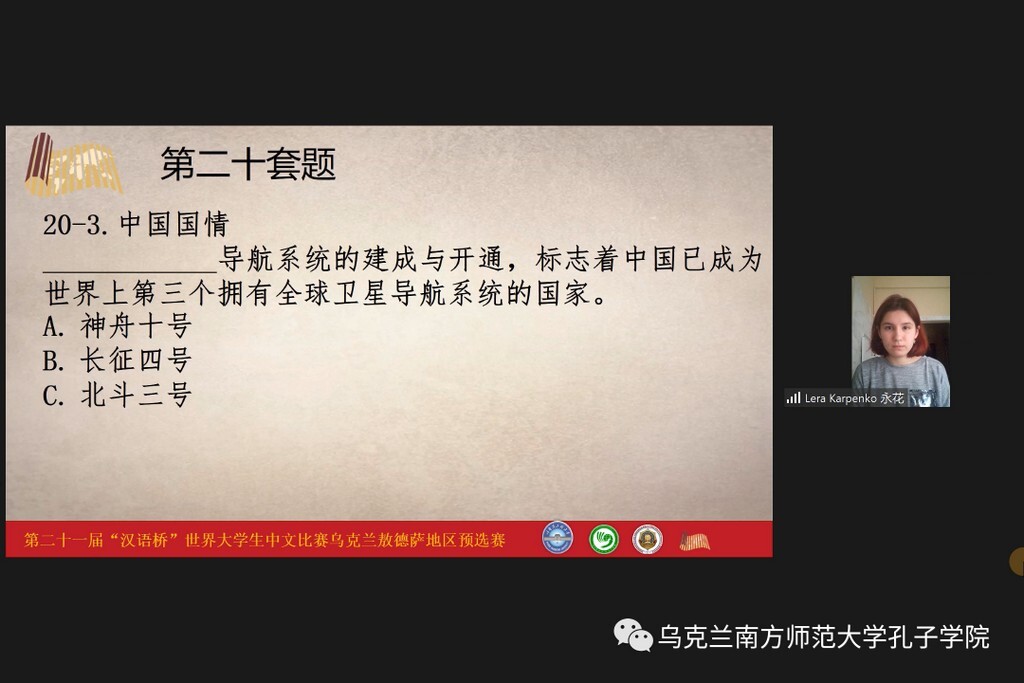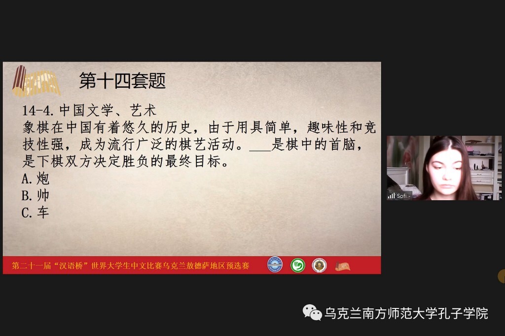 2021年12月17日,第二十一届“汉语桥”世界大学生中文比赛乌克兰南方地区预选赛,在乌克兰南方师范大学孔子学院的精心策划和组织下,以线上答题和视频展示相结合的方式,如约和大家相聚在云端。