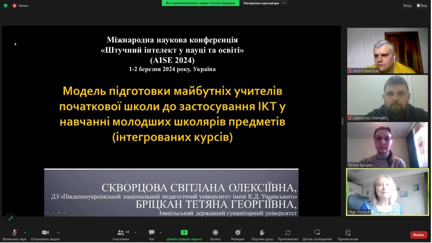 Окремий напрям дослідження вливу ШІ на підготовку педагогічних кадрів та формування їх використання інструментів ШІ в підготовці майбутніх вчителів інформатики говорив Володимир ЧЕРНИХ, про можливості ШІ для підвищення адаптивних властивостей систем управління навчанням – д.тех.н., проф. Тетяна МАЗУРОК, про модель підготовки майбутніх учителів початкової школи до застосування ІКТ у навчанні молодших школярів (інтегрованих курсів) – д.пед.н., проф. Світлана СКВОРЦОВА.