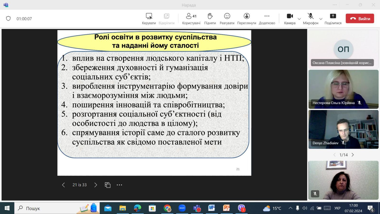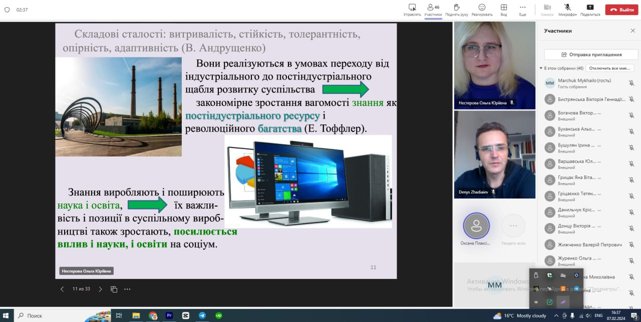 925 серпня 2023 року Генеральна Асамблея ООН ухвалила резолюцію, яка проголосила 2024 – 2033 рр. Міжнародним десятиліттям наук на користь сталого розвитку. Концепція сталого розвитку суспільства наголошує на необхідності встановлення балансу між задоволенням сучасних потреб людства і захистом інтересів майбутніх поколінь, включаючи їх потребу в безпечному та здоровому довкіллі.07 лютого 2024 року на запрошення завідувачки кафедри філософії та педагогіки доц. Ольги Нестерової (НТУ «Дніпровська політехніка», ЗВО-партнер) здобувачі третього (освітньо-наукового) рівня вищої освіти ОНП «Філософія» разом з Гарантом проф. Оксаною Петіновою відвідали гостьову лекцію на тему «Кореляція феномену освіти і сталого розвитку сучасного суспільства». Спікерка – канд. філос. наук, доц. Оксана Плаксіна (Придніпровська державна академія будівництва та архітектури). Говорили про філософію сталого розвитку, аналізували роль освіти в розвитку суспільства та наданні йому сталості, характеризували складові сталості (витривалість, стійкість, толерантність, опірність, адаптивність), тощо. Дякуємо за можливість долучитися до обговорення філософсько-освітніх актуальних питань сучасності!