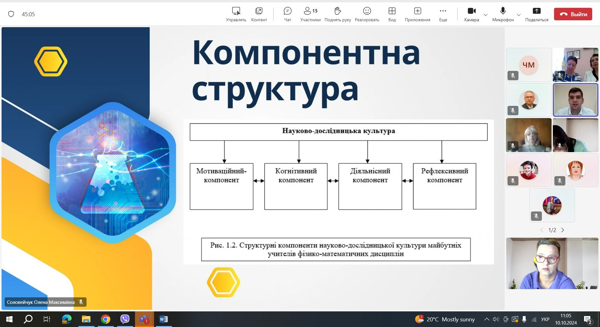 10 жовтня 2024 року на засіданні наукового (фахового) семінару з педагогічних наук відбулася публічна презентація та обговорення наукових результатів дисертаційного дослідження на здобуття науково-освітнього ступеня доктора філософії зі спеціальності 011 Освітні, педагогічні науки аспіранта кафедри педагогіки Дмитра БЄЛІТЧЕНКА на тему «Формування науково-дослідницької культури майбутніх учителів фізико-математичних наук» (науковий керівник: доктор педагогічних наук, професор, професор кафедри педагогіки Тетяна ОСИПОВА). Експертами виступили доктор педагогічних наук, професор Олександра ОРДАНОВСЬКА, кандидат педагогічних наук, доцент Ірина БАРТЄНЄВА, кандидат педагогічних наук, доцент Оксана НОЗДРОВА, які надали позитивні відгуки на дисертаційну роботу.
