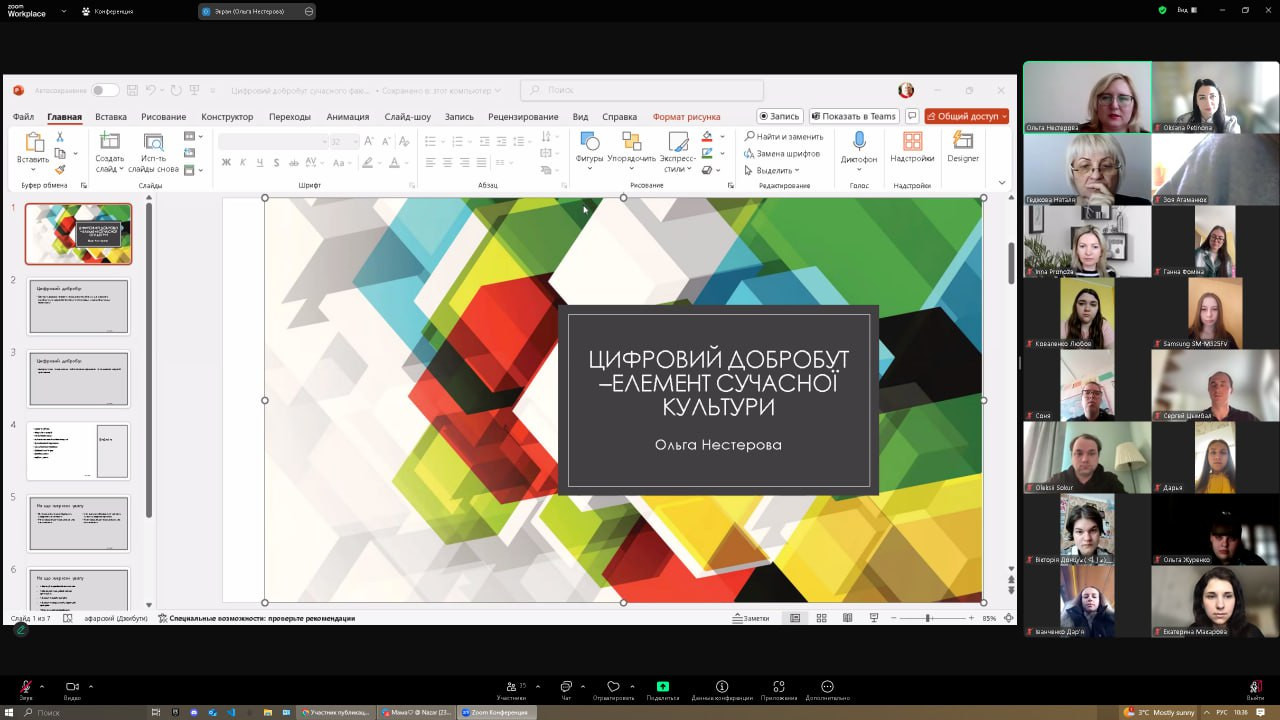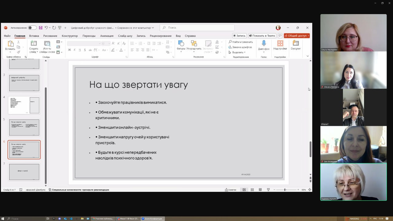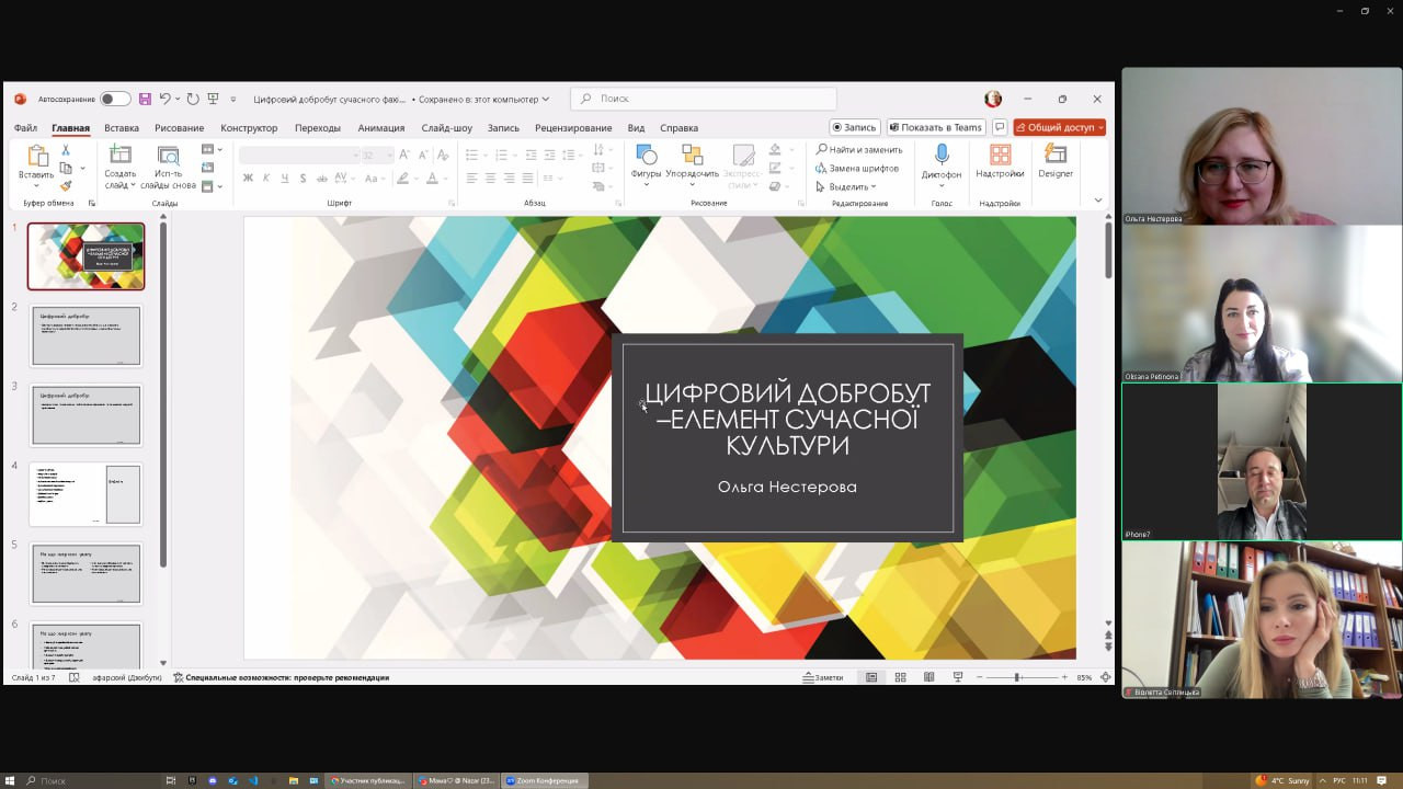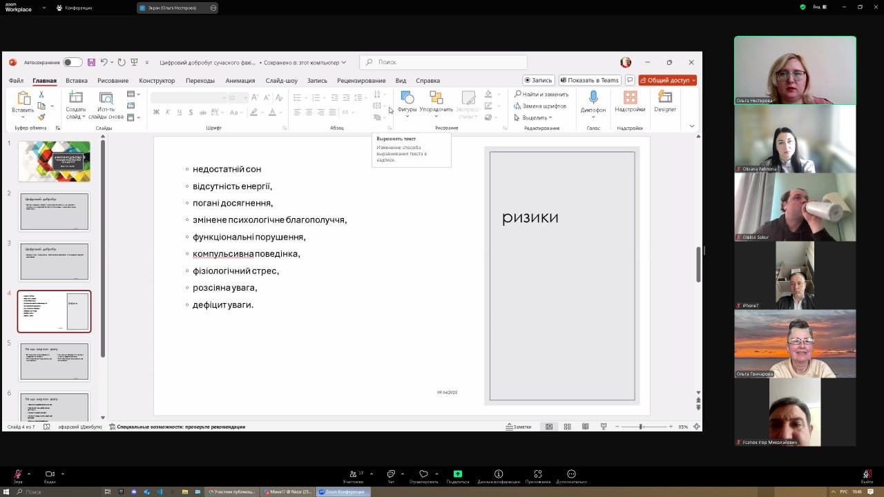 Сьогодні в рамках програми «Гостьовий лектор» на запрошення Гаранта ОНП «Філософія» проф. Оксани Петінової відбулася зустріч за участі завідувачки кафедри філософії та педагогіки НТУ «Дніпровська політехніка» (ЗВО-партнер) к. пед. н., доц. Ольги Нестерової.До заходу долучилися здобувачі різних освітніх рівнів та спеціальностей, – аспіранти (ОНП «Філософія», ОНП «Політологія», ОНП «Освітні, педагогічні науки»), магістранти (ОПП «Політологія. Українські та європейські політичні студії»), студенти (ОПП «Менеджмент соціокультурної діяльності», «Політологія», «Початкова освіта»), докторанти (Ольга Гончарова), а також науково-педагогічні працівники, зокрема, активну участь в обговоренні взяли проф. Зоя Атаманюк, проф. Наталя Гедікова та доц. Інна Проноза. Розглядали філософію цифрового добробуту, інформаційне перевантаження, цифрову залежність, баланс онлайн/офлайн, психологічну гігієну. В умовах інформаційного суспільства цифрова культура — це не тренд, а необхідність. Усвідомлене користування технологіями, турбота про ментальне здоров’я та розвиток компетентностей цифрового самозбереження — важлива складова освіти сучасного фахівця та основа особистої ефективності, сталого розвитку й академічного успіху. Дякуємо за цікаву зустріч!