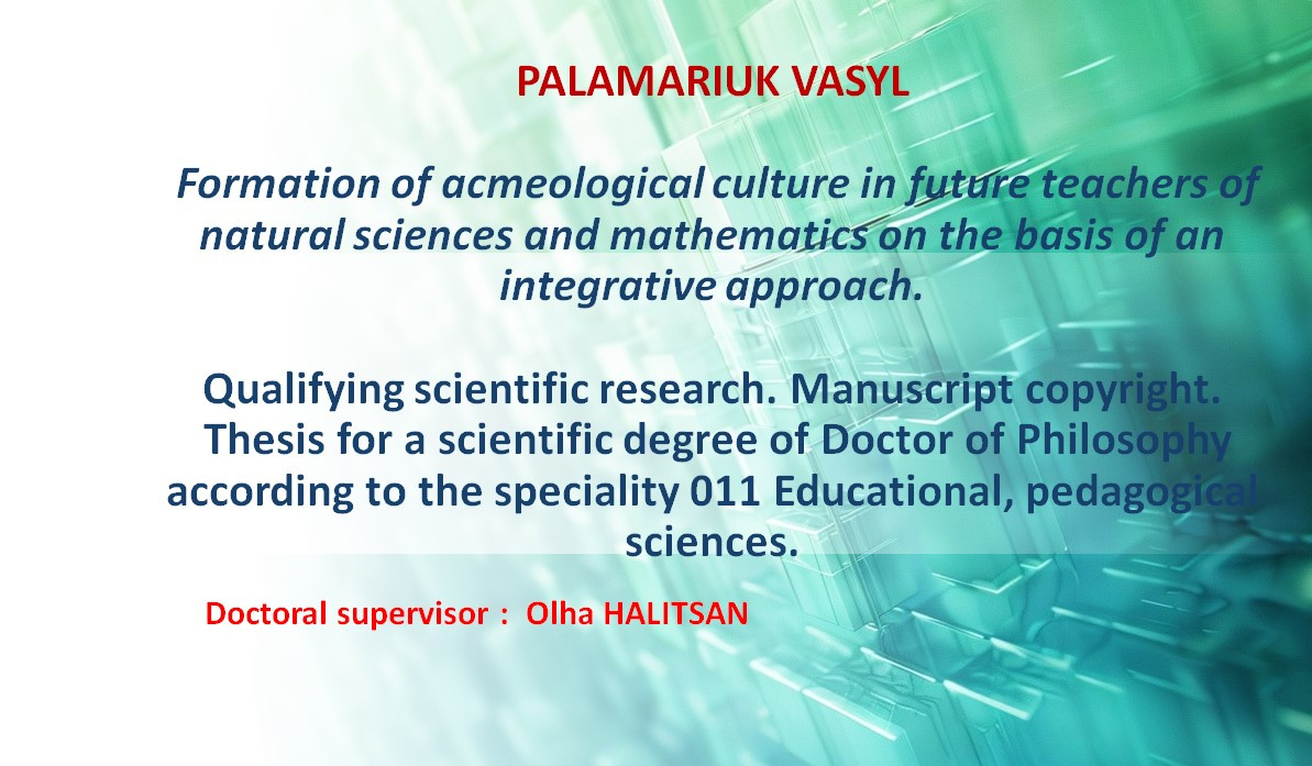 29 серпня 2025 року відбувся успішний захист дисертації Василя Автандиловича Паламарюка. Дисертаційне дослідження на здобуття наукового ступеня доктора філософії зі спеціальності 011 Освітні, педагогічні науки «Формування акмеологічної культури майбутніх учителів природничо-математичних спеціальностей на засадах інтегративного підходу» є результатом тривалого, системного, начасного експериментального дослідження аспіранта кафедри педагогіки та його наукового керівника – кандидата педагогічних наук, доцента Ольги Анатоліївни Галіцан.