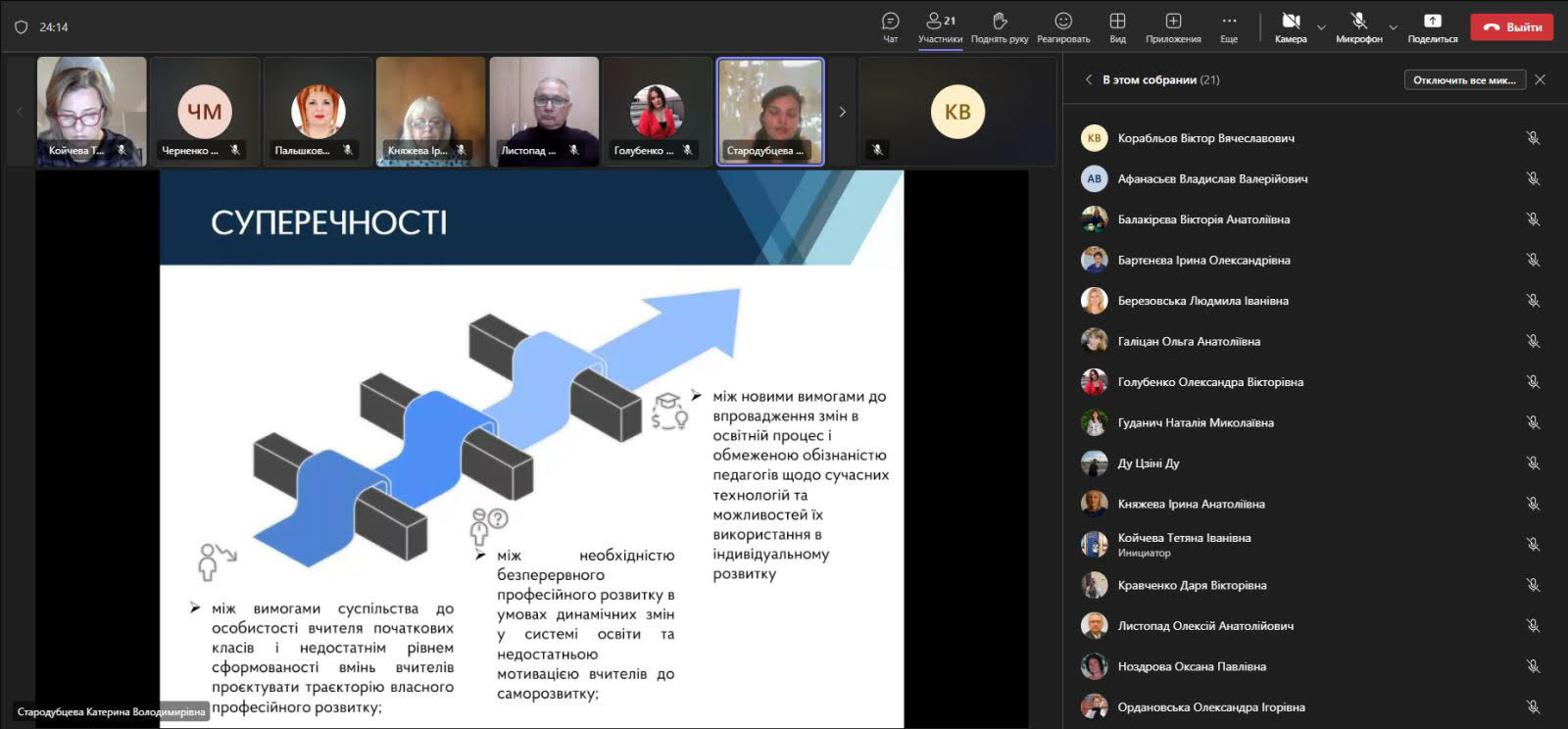 01 жовтня 2025 року на засіданні наукового (фахового) семінару з педагогічних наук відбулася публічна презентація та обговорення наукових результатів дисертаційного дослідження на здобуття ступеня доктора філософії зі спеціальності 015 Професійна освіта аспірантки кафедри педагогіки Катерини СТАРОДУБЦЕВОЇ на тему «Проєктування професійного розвитку вчителів початкових класів у системі післядипломної освіти» (науковий керівник: доктор педагогічних наук, професор, професор кафедри педагогіки Тетяна ОСИПОВА). Експертами виступили доктор педагогічних наук, професор Тетяна КОЙЧЕВА, доктор педагогічних наук, професор Олексій ЛИСТОПАД, кандидат педагогічних наук, доцент Ольга ГАЛІЦАН, які надали позитивні відгуки на дисертаційну роботу.