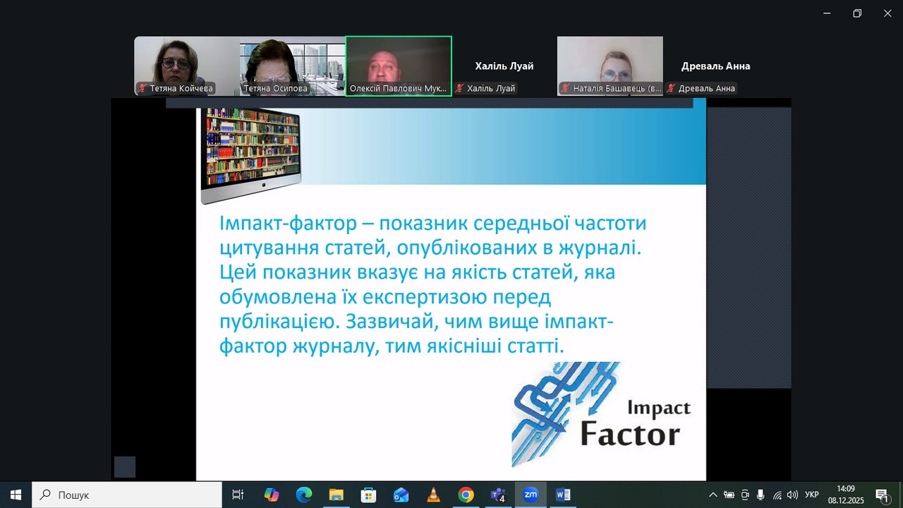 Image0108 грудня 2025 року відбулася гостьова лекція доктора педагогічних наук, професора кафедри педагогіки та освітнього менеджменту Комунального закладу вищої освіти «Одеська академія неперервної освіти Одеської обласної ради» МУКОВОЗА Олексія Павловича за темою «Наукометрія: основи, джерела даних і функціональні можливості». У лекції взяли участь здобувачі третього (освітньо-наукового) рівня вищої освіти ОНП «Освітні, педагогічні науки», «Професійна освіта», першого (бакалаврського) рівня вищої освіти спеціальності 014 середня освіта (фізична культара), гаранти, завідувач і викладачі кафедри педагогіки, наукові керівники аспірантів.