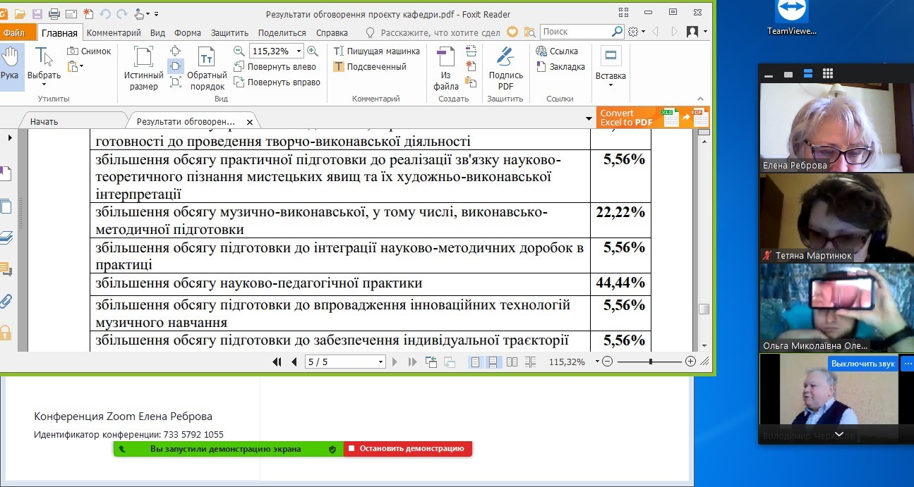 23.04-24.04 2021 р. на кафедрі музичного мистецтва і хореографії було проведено обговорення результатів он-лайн опитування усіх зацікавлених сторін з приводу підвищення якості навчання на ОНП 014 Середня освіта (Музичне мистецтво). Попередньо на сайті кафедри було проведено он-лайн опитування проекту ОНП, якій практично не змінився у порівнянні з попередньою редакцією. Така старатегія надала можливості повною мірою отримати інформацію саме з боку усіх зацікавлених сторін: здобувачі, роботодавці, стейкґолдери, академічна спільнота. Отримані данні було ретельно проаналізовано та подано їх статистичну обробку, з якою можна ознайомитися за посиланням