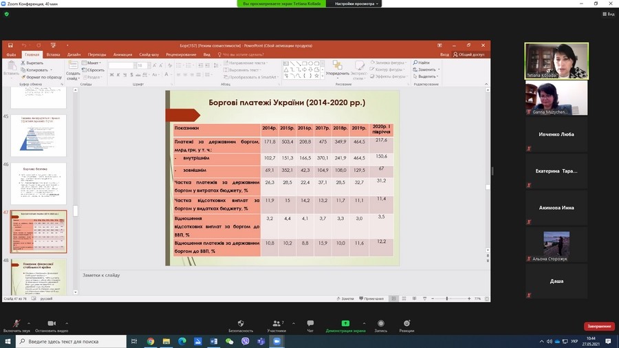 В Університеті Ушинського для аспірантів спеціальності 052 Політологія в межах елективної дисципліни «Сучасна державна політика» 27 травня 2021 року відбулася гостьова лекція кандидата економічних наук, доцента кафедри фінансів імені Л. Л. Тарангул Університету державної фіскальної служби України КОЛЯДИ Тетяни Анатоліївни на тему «Демократизація державного боргу та боргова безпека сучасних держав». Тетяна Коляда є знаним фахівцем в сфері публічних фінансів та управління боргом, яка на міждисциплінарному рівні розглядає економічні підвалини соціально-політичних процесів в сучасних державах, зокрема в країнах ЄС та в Україні, має багато цитованих публікацій за цією проблематикою в наукометричних виданнях. У межах цієї лекції експертка зосередила увагу на демократизації державного боргу та зростаючій ролі соціальних функцій сучасних держав, що спричинюють зростання боргового навантаження на національну економіку і перетворюють управління боргом на один з пріоритетів державної політики України та інших держав світу.