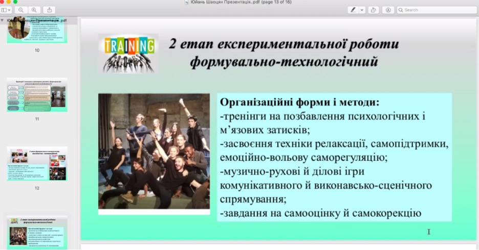 Члени ради високо оцінили актуальність теми дослідження, оригінальність та ефективність розроблених методик. Запровадження авторських методик Юань Шаоцяня здійснювалося на базі лабораторії «Інновації мистецької освіти» ще офлайн форматі; методика дуже зацікавила здобувачів та викладачів.