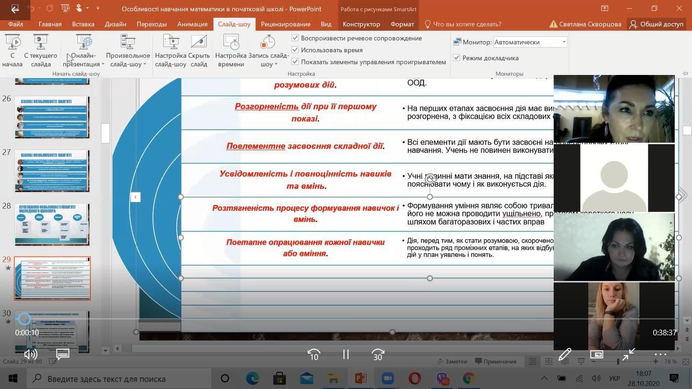 Програма навчання включала лекційні та практичні заняття з актуальних питань організації освітнього процесу в закладах загальної середньої освіти, впровадження інноваційних методів навчання (компресійні, інтенсивні, STEM тощо), що забезпечували провідні кафедри Університету Ушинського: