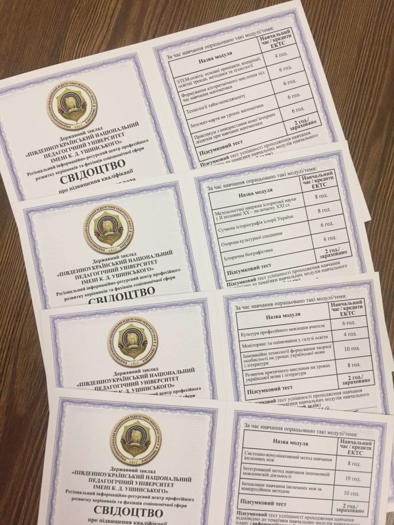 Упродовж серпня-жовтня 2020 року в Південноукраїнському національному педагогічному університеті імені К. Д. Ушинського було проведено курси підвищення кваліфікації за програмами: