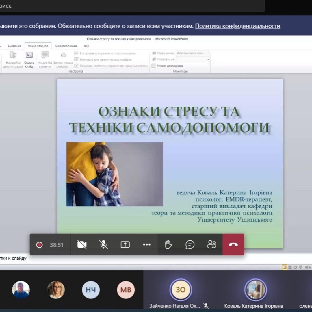 В роботі онлайн-семінару взяли участь понад 100 осіб, які дізналися про ознаки стресу та опанували техніки самодопомоги («Заземлення, «Дихання», «Обійми метелика» та ін.), які стануть в нагоді кожному освітянину в роботі та повсякденному житті.