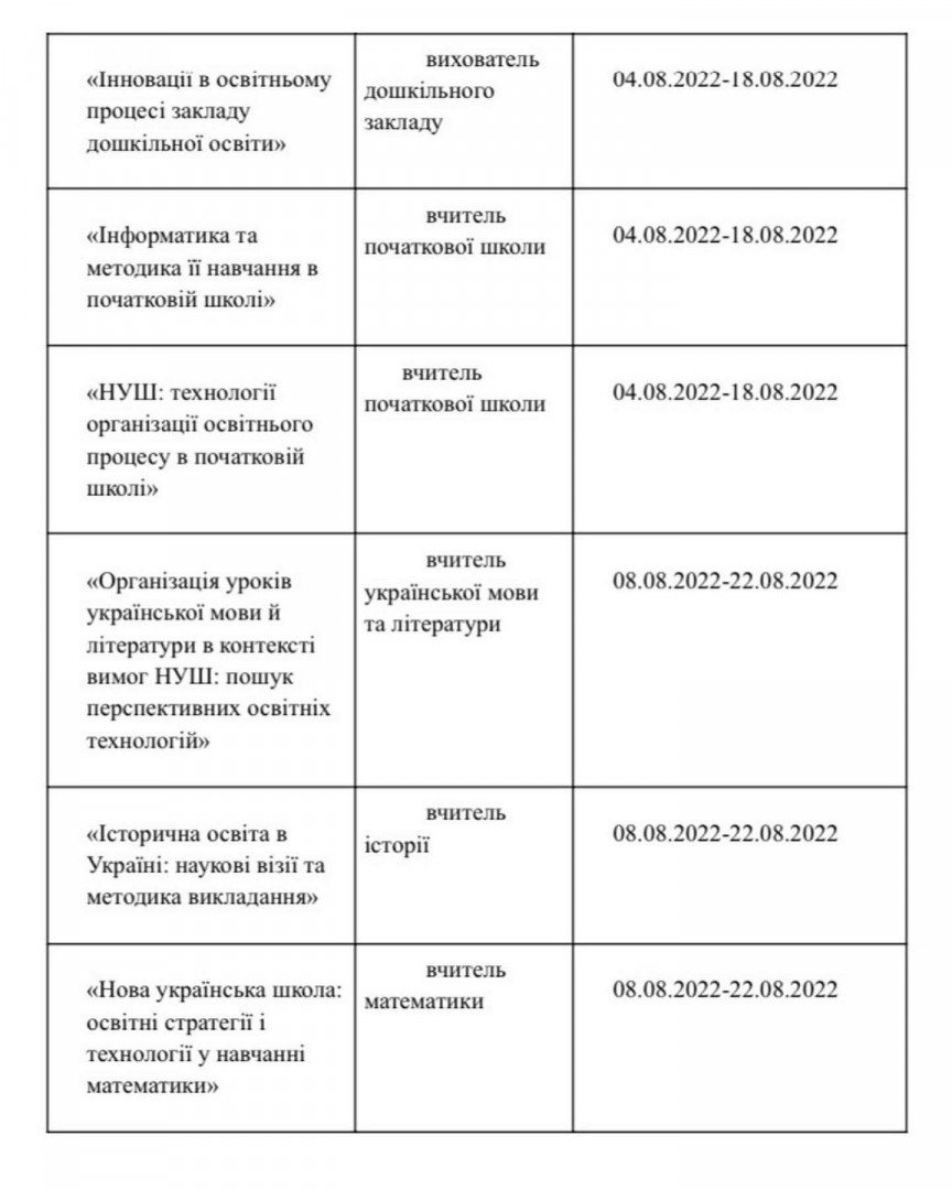 Серпень 2022 року Обсяг: 30 годин/ 1 кредит ЄКТС Формат навчання: дистанційно Вартість: 400 гривень Для вчителів ЗЗСО, вихователів ЗДО, педагогічних працівників, керівних кадрів закладів освіти, практичних психологів та соціальних педагогів Анкета реєстрації доступна за посиланням: